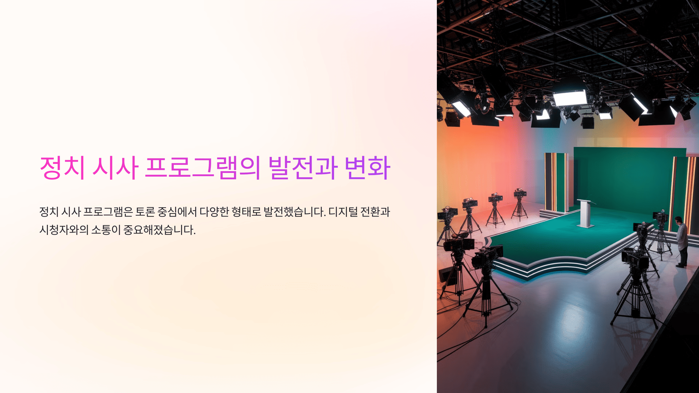 한국의 정치 시사 프로그램은 정보 전달과 여론 형성이라는 중요한 역할을 수행하고 있다. 디지털 시대의 변화에 맞춰 새로운 형식과 플랫폼을 도입하면서도, 공정성과 객관성이라는 기본 가치를 지키려 노력하고 있다.
