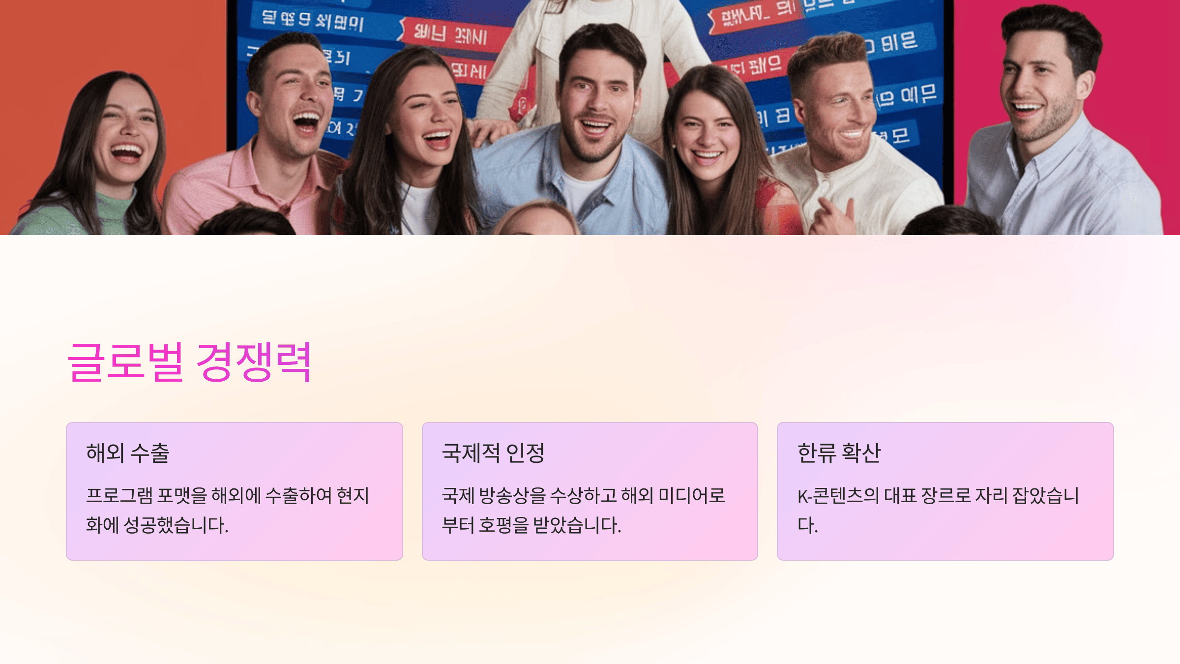 - 한류 확산: K-콘텐츠의 대표 장르로 자리잡았다.