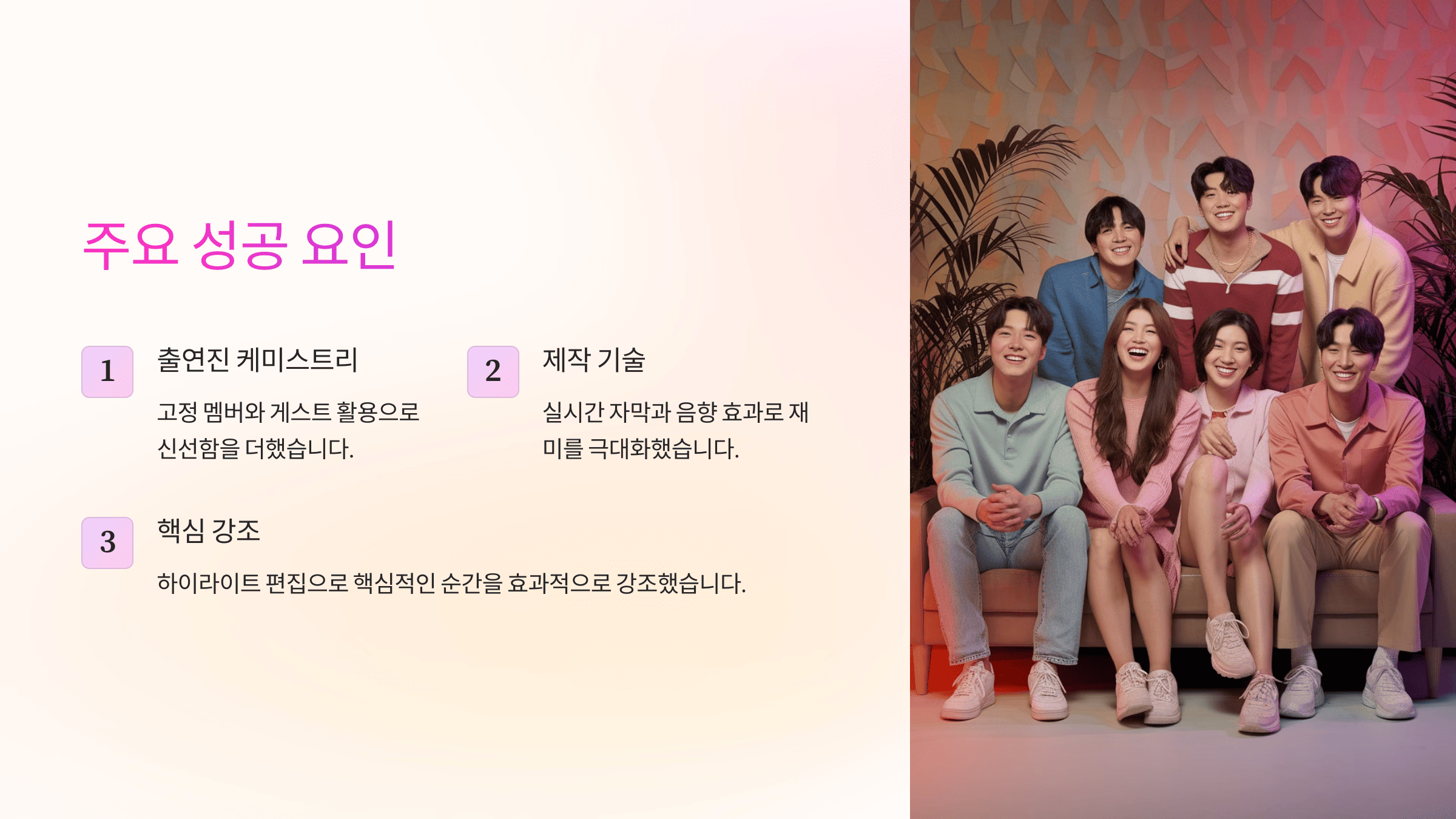 - 리액션 중심: 출연자들의 자연스러운 반응을 중요하게 다루었다.