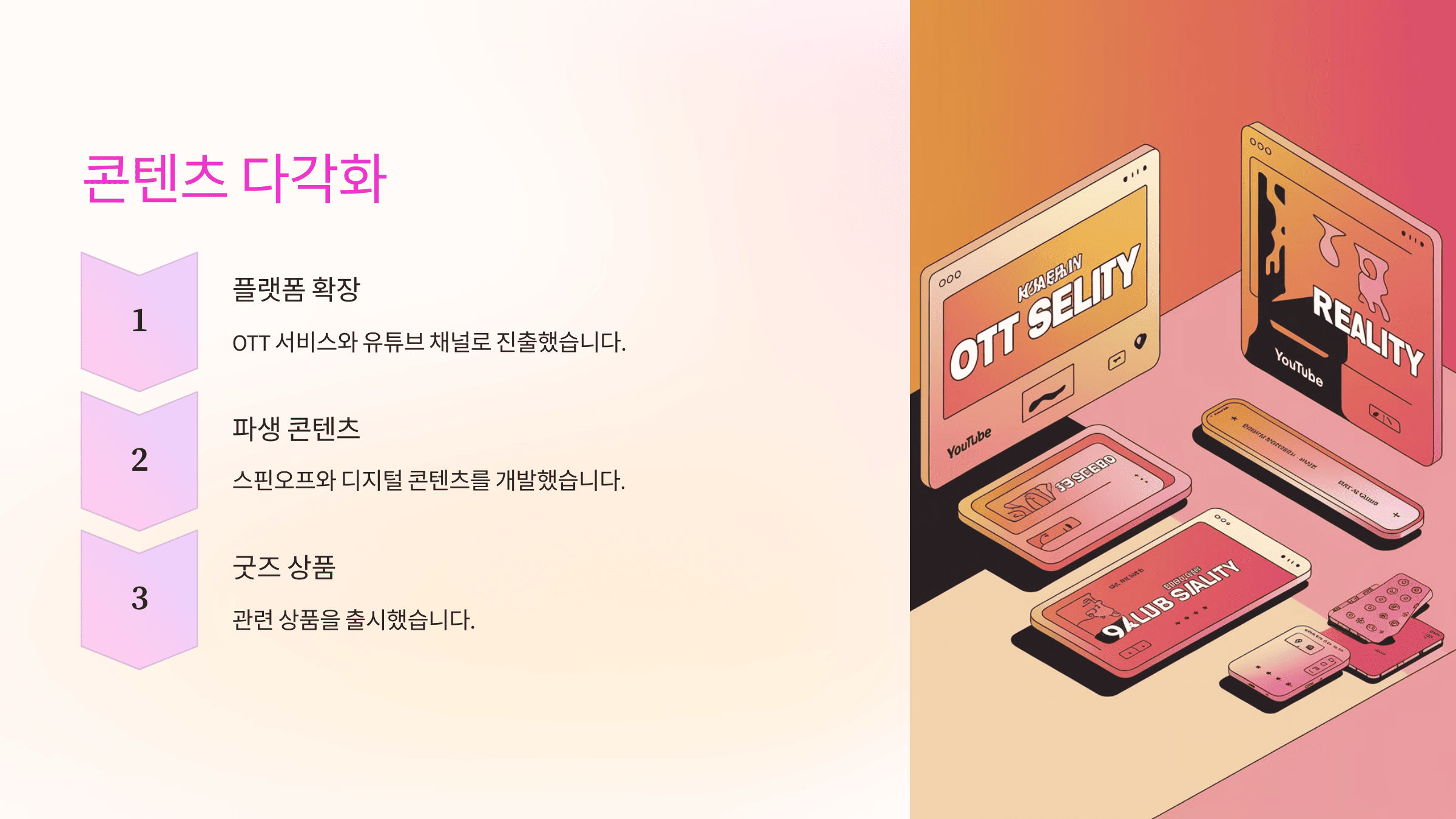 - OTT 서비스: 스트리밍 플랫폼으로 진출하였다.