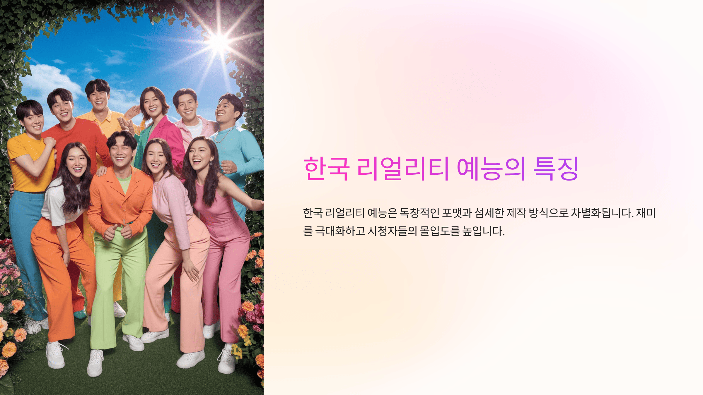 한국의 리얼리티 예능은 독창적인 포맷과 뛰어난 제작 기술을 바탕으로 글로벌 시장에서 큰 성공을 거두고 있다. 특히 자연스러운 재미와 감동을 전달하는 능력이 세계적으로 인정받고 있다.